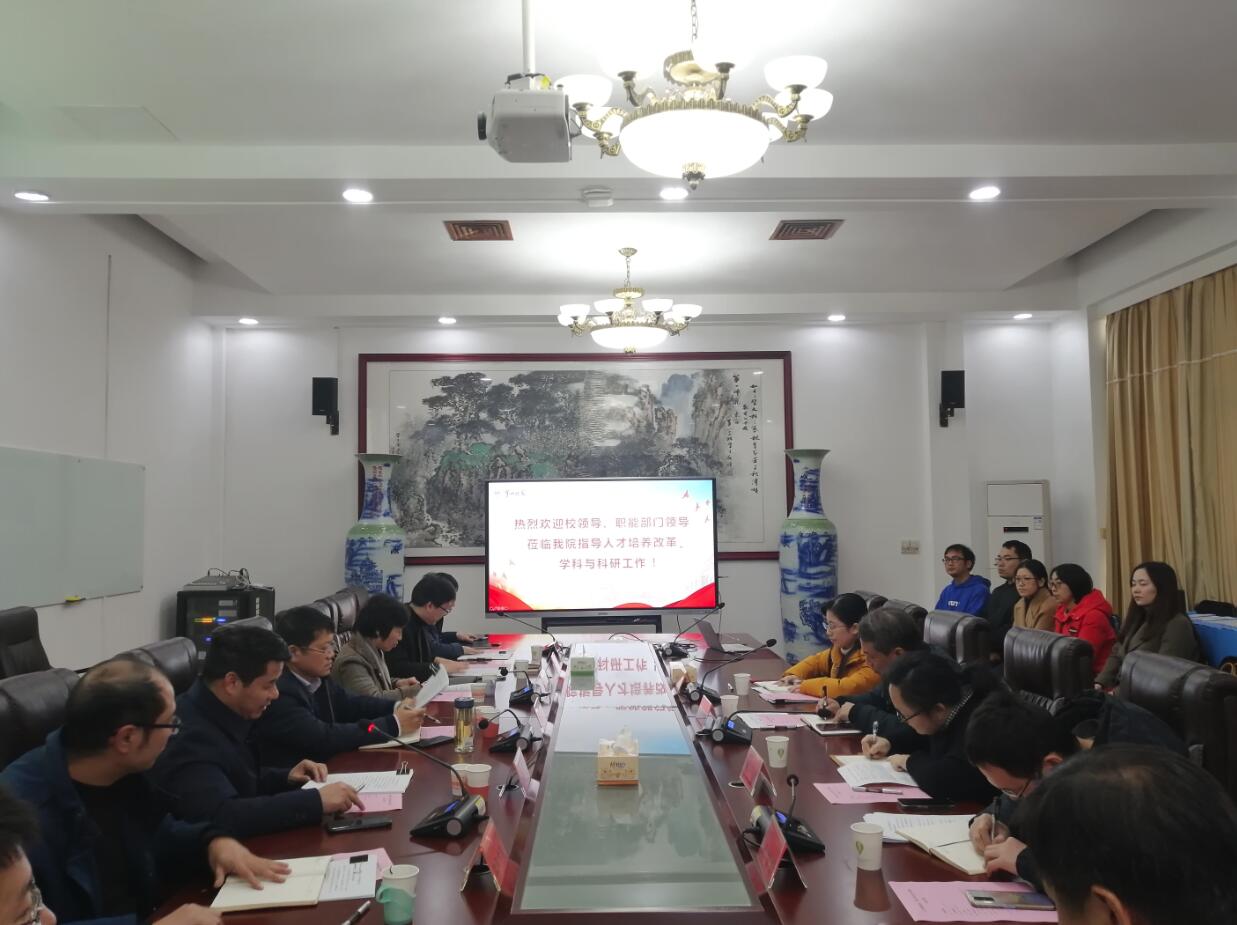 12月14日下午,校党委书记罗成翼、校长童小娇、校党委委员、副校长周发明率学科建设与发展规划处、教务处和科研处负责人一行深入数学与统计学院就人才培养方案改革及学科科研工作展开调研并召开座谈会。数学与统计学院领导班子成员、系(教研室)主任、科室主任及部分博士教授代表参加了座谈会。座谈会由副校长周发明主持。
