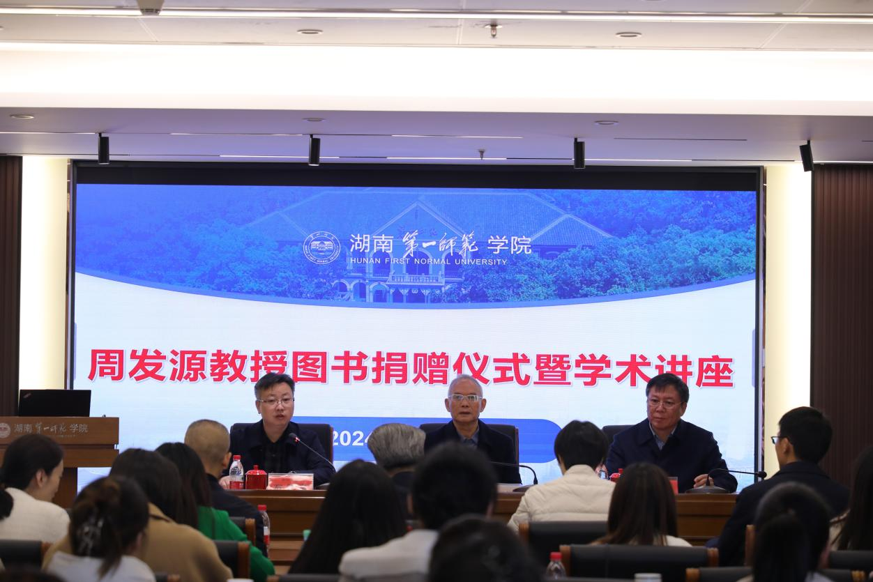 近日,湖南省生态文明研究与促进会会长、省碳达峰碳中和专家咨询委员会副主任、省社科联原党组书记周发源研究员应邀在百熙楼701会议室作题为“我的学问人生”专题报告。讲座由副校长石元泉主持,我校老师及研究生代表聆听讲座。